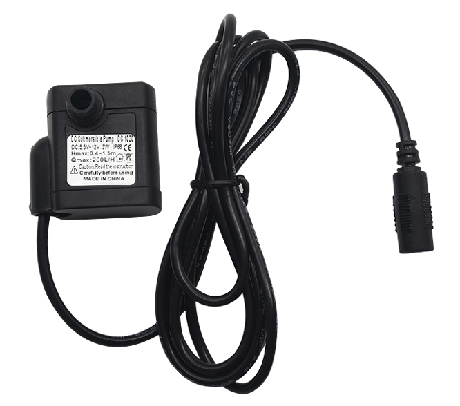 BRUSHLESS MOTOR FOR LONG LIFE. OPERATING VOLTAGE 5.5-12VDC 1-3W, 200L/H, Hmax 0.4-1.5m, ( ALSO AVAILABLE IN 5VDC WITH USB PORT see 60720113), SIZE 38x40x28, PIPE FITTING 8mm,