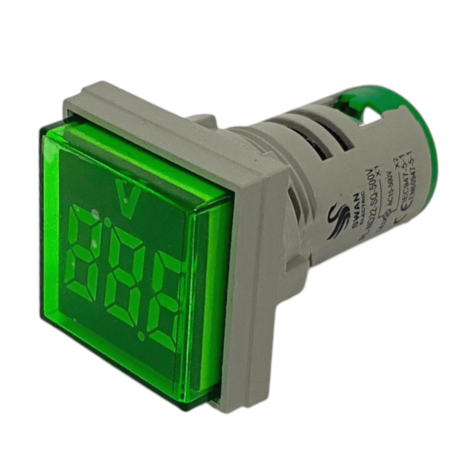 22mm PANEL MOUNT LED METER, THREE DIGIT VOLTAGE INDICATOR 20-500VAC GREEN, SQUARE, PILOT LIGHT TYPE