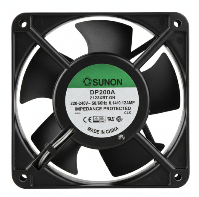 AXIAL AC FAN / 220VAC / 117CFM / 120x120x38 / DUAL BALL BEARING / 3150 RPM, / 120mA / 21 WATTS / 50dBA, TERMINAL END NO LEADS. ALUMINIUM FRAME, PLASTIC / PBT BLADES.