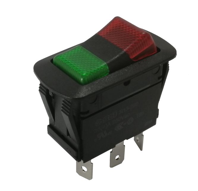Memo     WATERPROOF ROCKER SWITCH, RED/GREEN NEON ILLUMINATED, SPDT,ON-OFF-ON, 10A @ 250V,CENTRE LIVE SWITCHED EITHER SIDE + NEUT OTHER CENTRE. HOLE L=36mm W=21mm