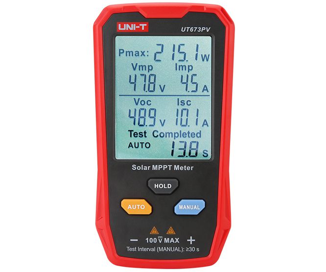 MEASURES : MPPT / MAXIMUM POWER, PEAK POWER VOLTAGE AND CURRENT, OPEN CIRCUIT VOLTAGE, AND SHORT CIRCUIT CURRENT. 800W, 60V MAX. WITH MC4 TEST LEADS.