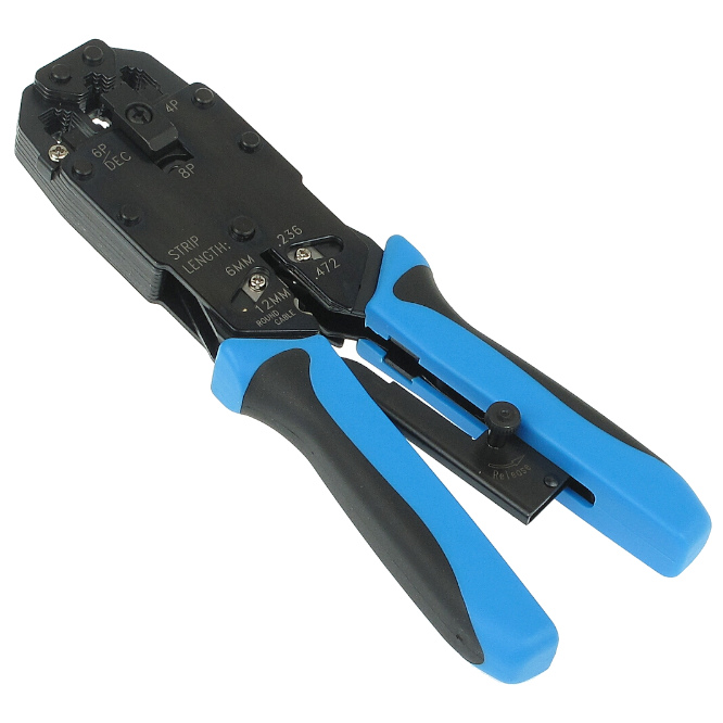 MODULAR CRIMPING TOOL FOR RJ45,RJ12,RJ11,RJ10, RJ9/RJ09 AND DEC WITH RATCHET. CUTTER & STRIPPER FOR FLAT AND ROUND WIRES