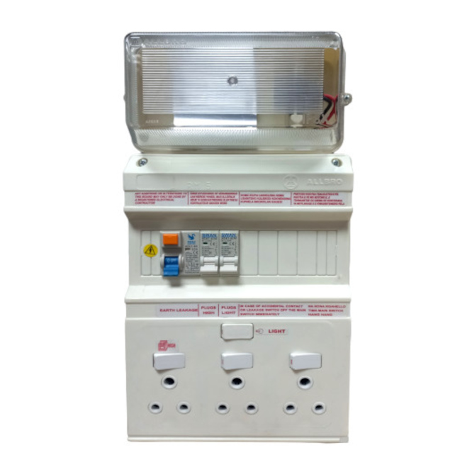 PRE-POPULATED READY DB BOARD WITH BULKHEAD LIGHT. FITTED, WIRED AND CERTIFIED (COC), WITH SWAN 63A/30mA EARTHLEAKAGE AND TWO 20A 3KA CIRCUIT BREAKER.
